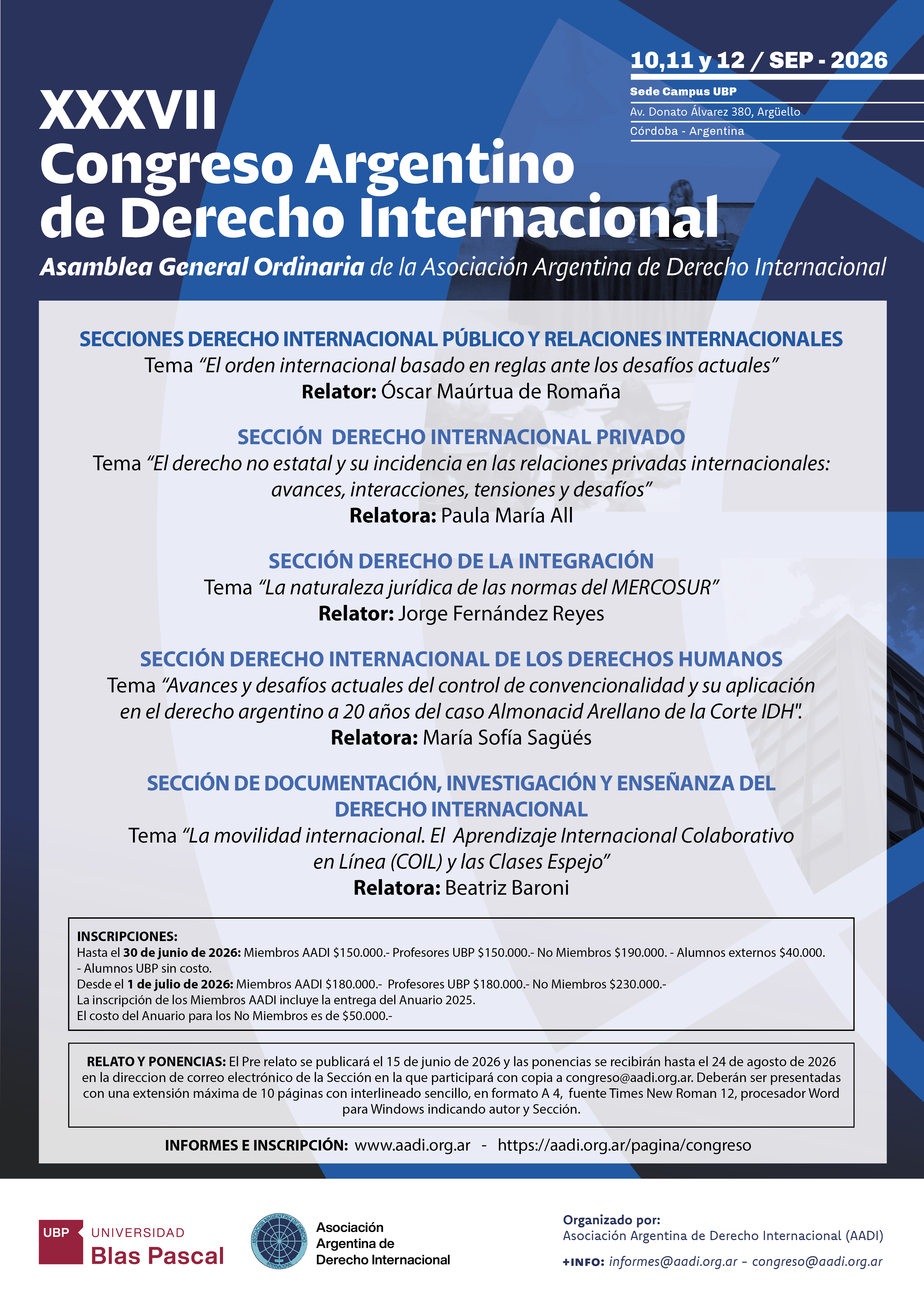 La Asociación Argentina de Derecho Internacional fue fundada en el marco del Primer Seminario de Profesores e Investigadores de Derecho Internacional celebrado en la ciudad de Rosario, República Argentina, los días 3 a 6 de Noviembre de 1968. Es una Asociación de carácter científico, sin fines de lucro, que nuclea más de doscientos docentes e investigadores del derecho internacional de las distintas Universidades del país y cuenta con Miembros correspondientes en el extranjero. La A.A.D.I. funciona como un ámbito para el intercambio de conocimientos científicos, para la producción y divulgación de estudios internacionales. En todo momento la Asociación organiza y auspicia distintos eventos científicos de carácter nacional e internacional en la materia. Su actividad principal es el Congreso Argentino, que se celebra, al menos, cada dos años. Además la Asociación publica un Anuario con artículos científicos vinculados a la problemática actual del Derecho Internacional y un Boletín periódico, con las novedades y temas de interés para sus asociados. Personería Jurídica Resolución Número 761/85. Provincia de Santa Fe.